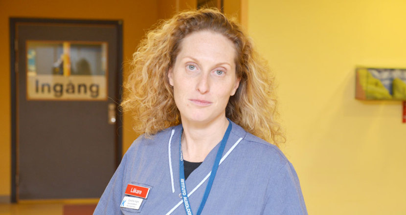 Caroline har så kallad bakjour detta arbetspass och telefonen ringer då och då. Hennes pappa har jobbat som läkare på Akademiska sjukhuset i Uppsala och hans hängivenhet har påverkat henne.