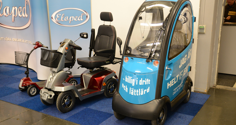 Mellan två utställningsmontrar kom sedan Mats åkande i sin manuella rullstol på larvband och ekipaget drog onekligen ögonen till sig. För Mats är ryggmärgsskadad och kör med en liten Joystick och under själva rullstolen rullar två larvband, som på en liten låg minibulldozer.