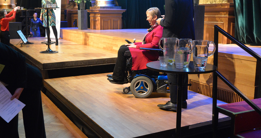 Lise Lidbäck ordförande, Kristina Niemi kanslichef och Sara DeHaas utredare för Neuro deltog på Vårdanalys seminariedag om digitala vårdkontakter i morgon. Lise Lidbäck var med i paneldebatten och fick uppleva en av de bättre lösningarna för scenhissar i landet, för att komma upp på scenen som de andra. En hel golvsektion var hiss i Nalens lokaler på Regeringsgatan 74 i Stockholm. Foto: Håkan Sjunnesson / Neuro