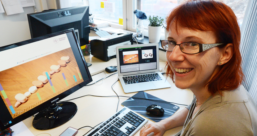 Doktoranden Sara Riggare vid skrivbordet på Karolinska Institutet. Foto: Håkan Sjunnesson / Neuro