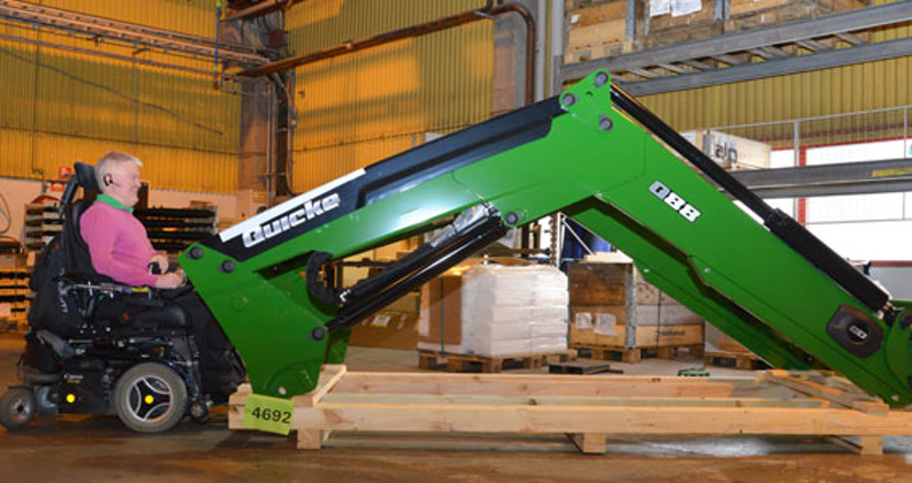 I den väldiga industrihallen håller Anders Jonsson koll på tusentals komponenter till lastarmar för jordbrukstraktorer. Sedan 1988 är han anställd på det branschledande företaget. "Min kunskap i tyska var vägen in och jag stortrivs. Fast det är klart att en del kunder först hajar till, när de möter mig som företagsrepresentant i elrullstol."