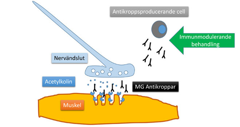- Vid MG stör antikroppar signaleringen mellan nervände och muskelfiber genom att blockera eller skada muskelns receptorer för signalämnet acetylkolin.