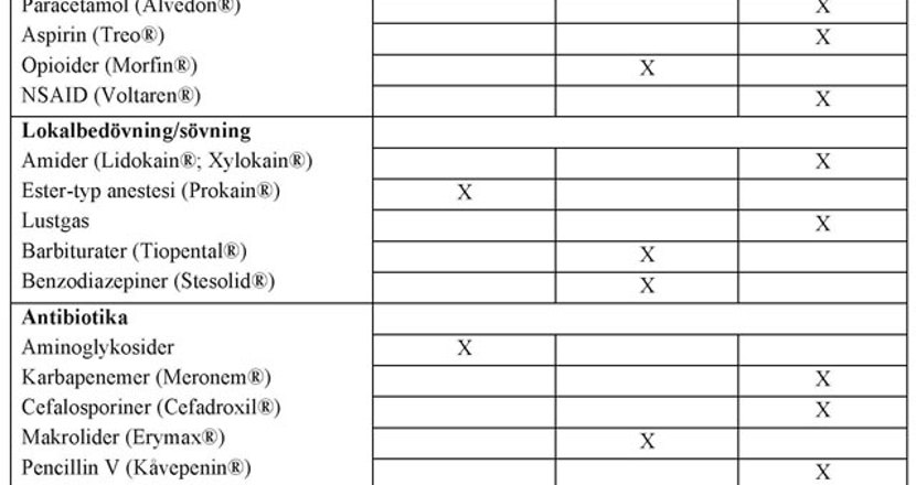 Tabell 1. Vanliga läkemedel inom tandvården och deras säkerhet vid MG. Konkreta exempel är givna för de flesta medicingrupperna.