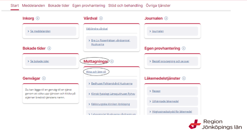 Man kan även lägga genvägar till sina favoritsidor, till exempel till den neurologmottagning man går till. För att kunna se sina bokade tider på en mottagning så behöver man först ha lagt till den i sin profil.