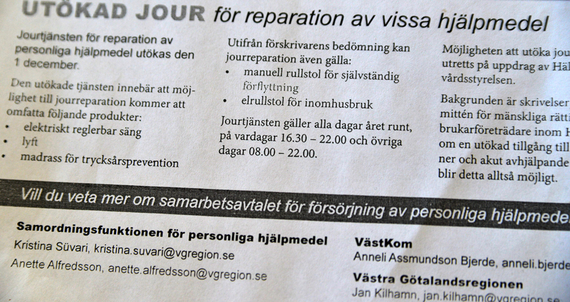 - Elrullstolen är idag mitt och mångas allt för att kunna vara aktiva ute i samhällslivet. Stolarna måste fungera. Därför behövs verkligen denna jourreparationsverksamhet som beviljats i alla Västra Götalands 48 kommuner. Men få känner till denna viktiga hjälp och det här borde införas i hela landet, tycker Jens Sahlin.