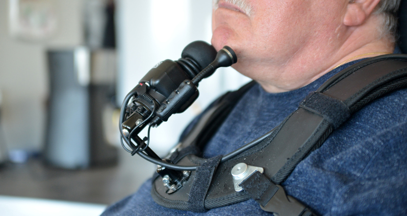 - Det var det ingen som upplyste mig om först märkligt nog, men när jag fått tillgång till den, är det en fantastisk frihet, säger Jens Sahlin. Han trycker med hakan på körreglaget i form av en joy-stick. Det är monterat på ett ok han bär framför sig på bröstet.