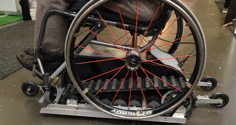 Mellan två utställningsmontrar kom sedan Mats åkande i sin manuella rullstol på larvband och ekipaget drog onekligen ögonen till sig. För Mats är ryggmärgsskadad och kör med en liten Joystick och under själva rullstolen rullar två larvband, som på en liten låg minibulldozer.