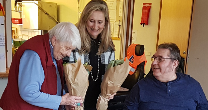 Den mindre förening Borgen i Neuro Göteborg hade nyligen 30-års jubileum och ordförande Inger Larsson (t.v.) och Lars-Gunnar Andersson fick smörgåstårta och blommor av Madeleine Kyllerfeldt från moderföreningen I Göteborg. Foto: Kent Andersson
