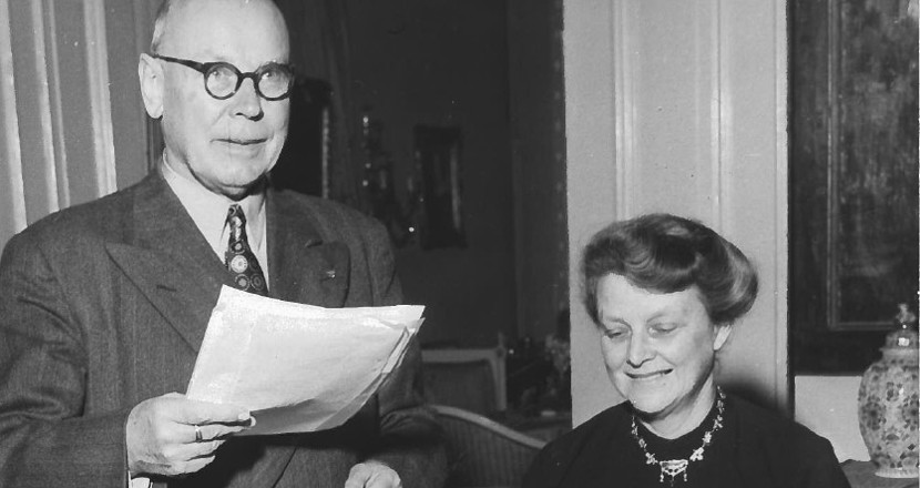 Svartvitt foto på en man och en kvinna. Mannen håller i ett papper. Kvinnan skriver på en skrivmaskin. Foto.