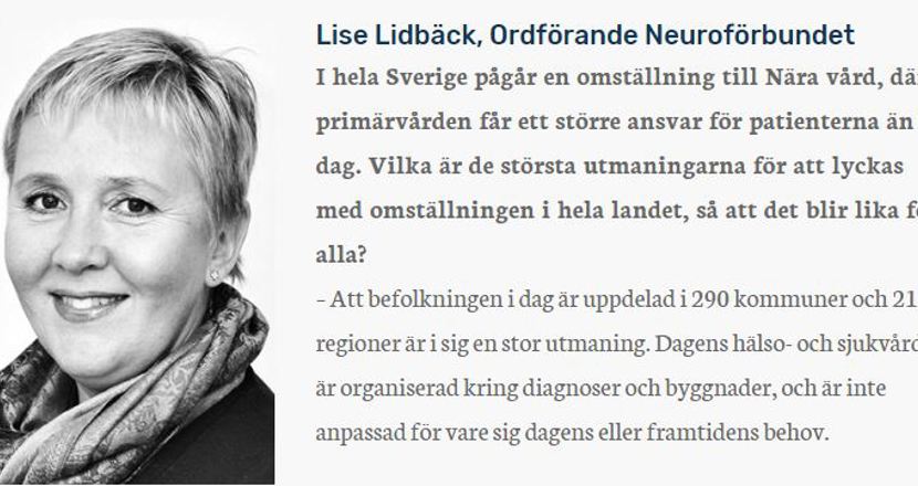 Omställningen till nära vård pågår runt om i landet. Men än är det långt kvar. Horizont har frågat företrädare för äldre, personer med kronisk sjukdom och socialministern vad de ser som den största utmaningen – och vad de själva kommer att göra för att driva utvecklingen framåt. Neuros ordförande Lise Lidbäck var en av dem som fick frågan.