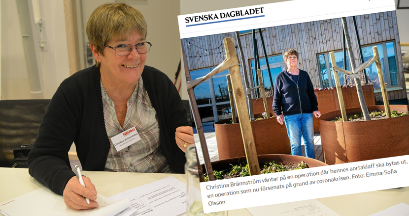 Christina Brännström är ordförande i föreningen Neuro rehab C-län och idag den 12 maj 2020 är hon på omslaget av Svenska Dagbladet. Hon behöver rehab och en hjärtoperation, men får som många andra nu vänta på obestämd tid, på grund av coronapandemin.