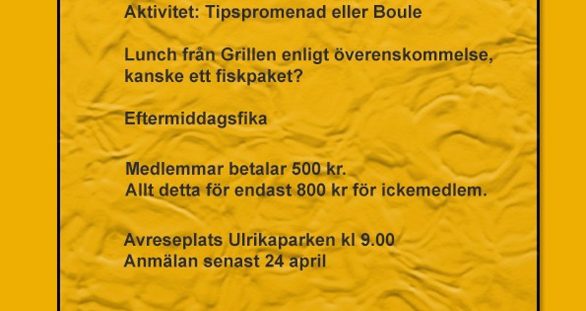 7 maj kl. 9.00 åker vi från Ulrikaparken i Ulricehamn till Neuroförbundet Göteborgs anläggning Strannegården i Onsala