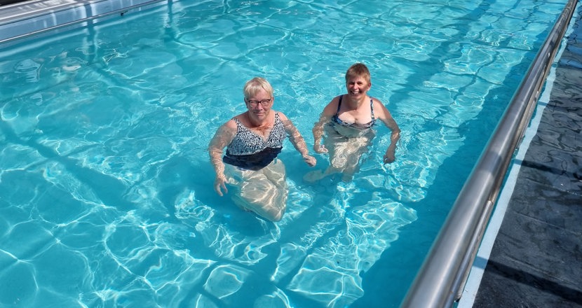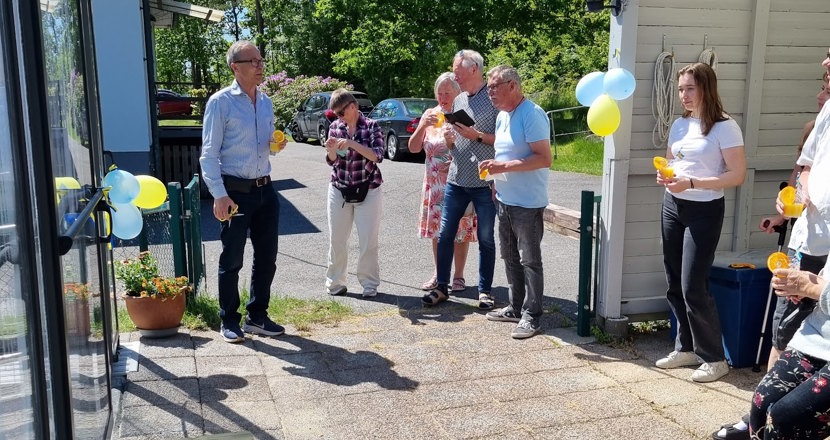 Vi var 26 personer som var med när Kent Andersson klippte det blågula bandet till vår nyrenoverade pool. Poolen har fått ny fin beläggning och ett tak i sex sektioner som kan skjutas undan soliga och varma dagar.