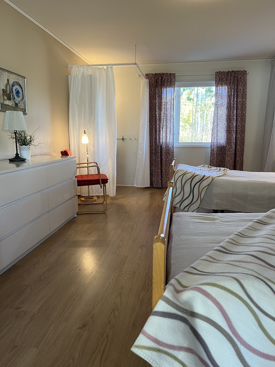 Det finns även ett stort enkelrum i paviljongen direkt i anslutning till bastun och relax där det finns stort badrum med dusch och toalett.