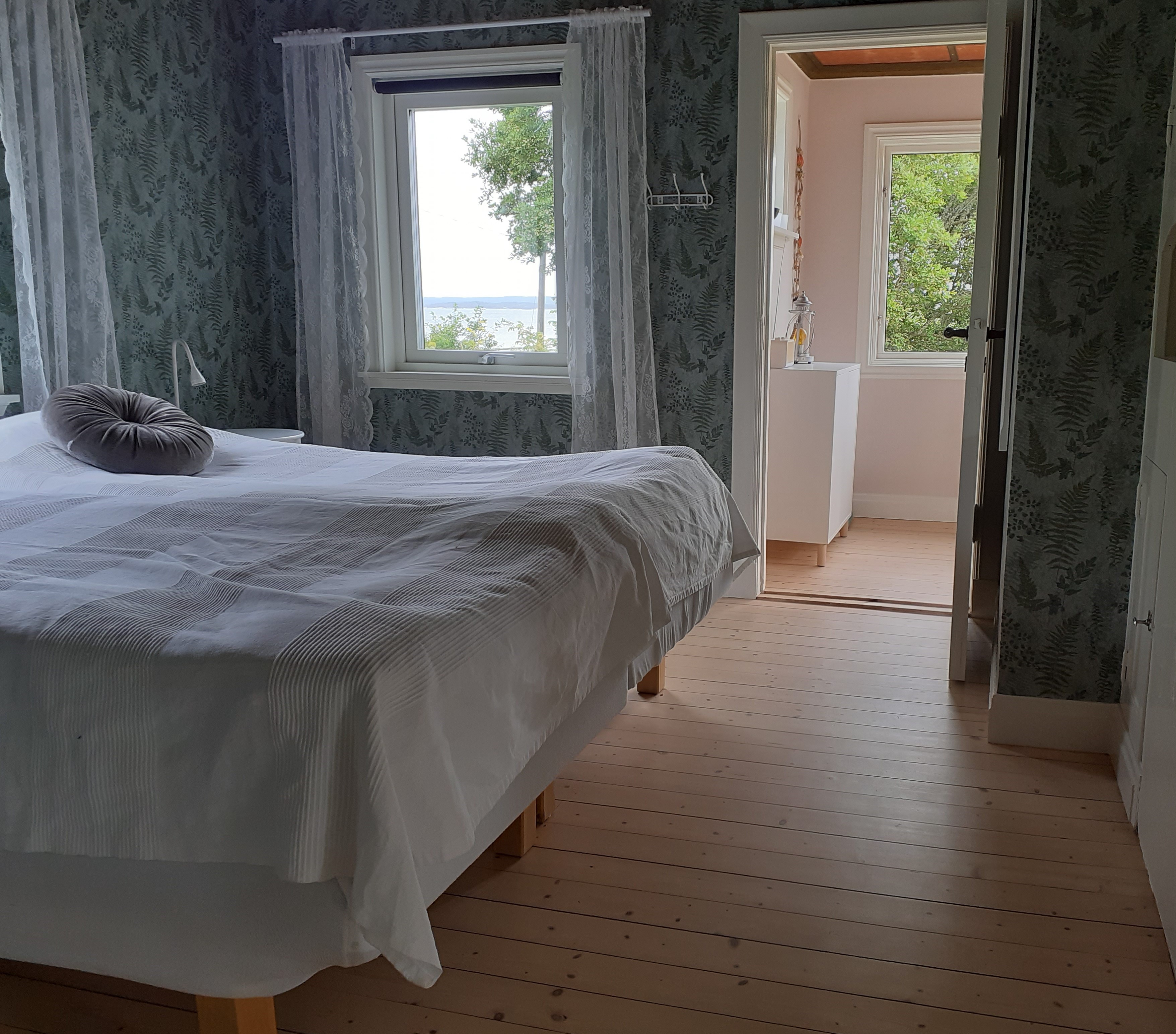 På övervåningen finns två dubbelrum det ena har utsikt över poolen och paviljongen det andra har utsikt över grönområde och parkeringen. I anslutning finns toalett med handfat. Duschen delar man med gästerna på entréplan.