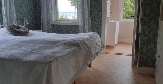 På övervåningen finns två dubbelrum det ena har utsikt över poolen och paviljongen det andra har utsikt över grönområde och parkeringen. I anslutning finns toalett med handfat. Duschen delar man med gästerna på entréplan.