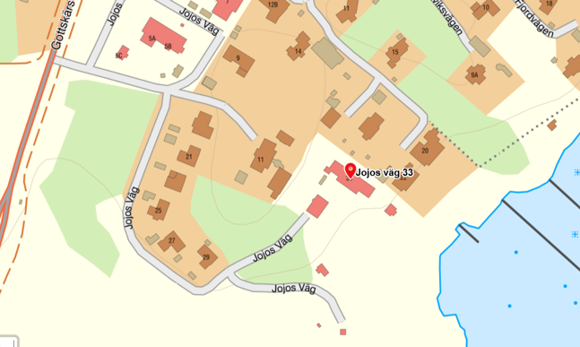 Efter 1,5 km, sväng vänster in på Jojos väg, skylt D&J Strannegården
