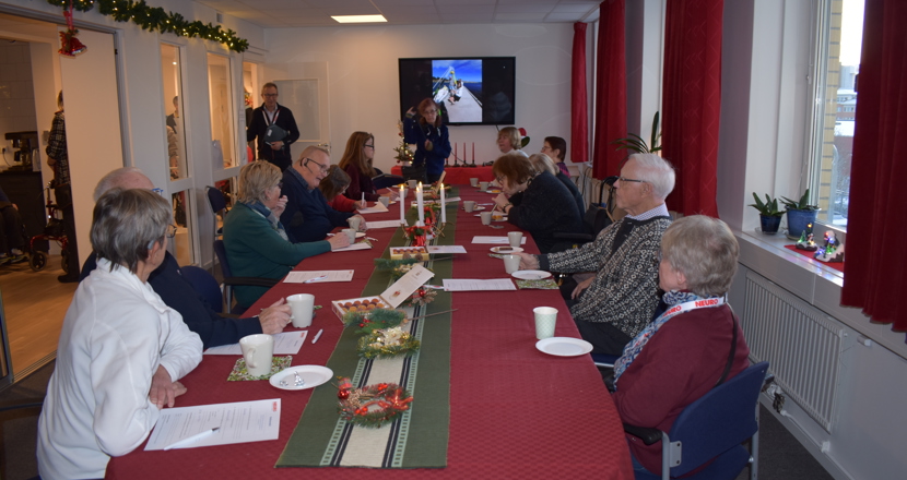 Här kunde man dricka kaffe, julmust och äta lussekatter, pepparkakor och godis medan man pratade med gamla och nya bekanta. I stora rummet visades det bilder från sommaren på Strannegården och Katarina svarade på frågor om man hade några. En medlemsenkät delades ut så medlemmarna kunde önska sig olika aktivitet till kommande år.