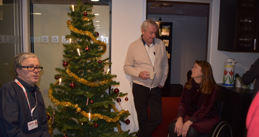 I den stora entrén hade vi fått låna ett rum för kvällen, så medlemmarna kunde hänga av sig sina ytterkläder innan de antingen tog hissen upp till kansliet eller gick in i restaurang Måltiden för lite glögg och tilltugg. De som kom till vår lokal möttes av många glada medlemmar, kanslipersonal och styrelsemedlemmar. Överallt var det juldekorerat och julmusiken spädde på julstämningen.