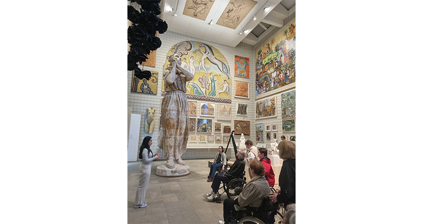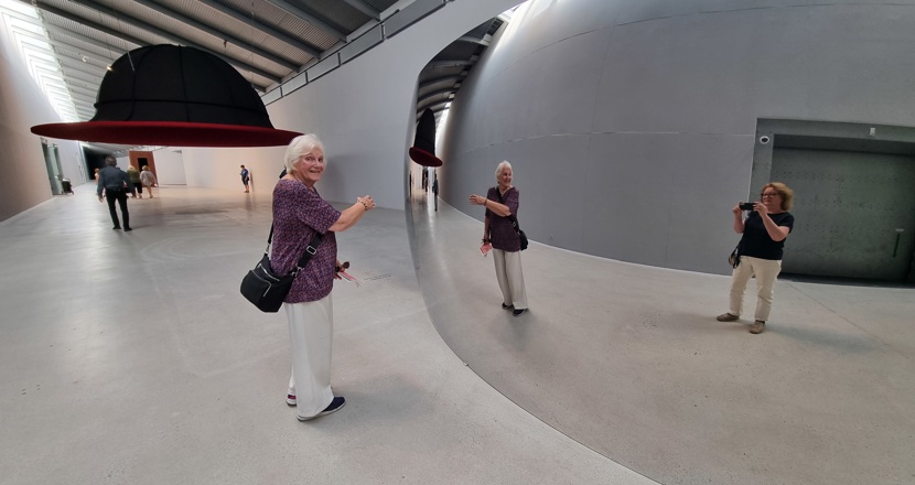 Efter en vacker busstur över Öresundsbron och en kort tur söderut kom vi så fram till Arken Konstmuseum för samtidskonst. Vi började med en god lunch som serverades på andra våningen i detta mycket speciella hus. Inga räta vinklar, inte ens de bärande balkarna stod rakt upp! Tyvärr kunde vi inte få den guidning vi hade beställt eftersom vi ju kom på fel dag. Huvudnumret våren 2024 är den världsberömde konstnären Anish Kapoors imponerande skulpturer och installationer. En vattenvirvel som drar allt nedåt, plåtkonstruktioner som ger spegelbilder med overkliga avstånd, en gigantisk boll som egentligen inte fanns (från sidan såg man att väggen var platt…).