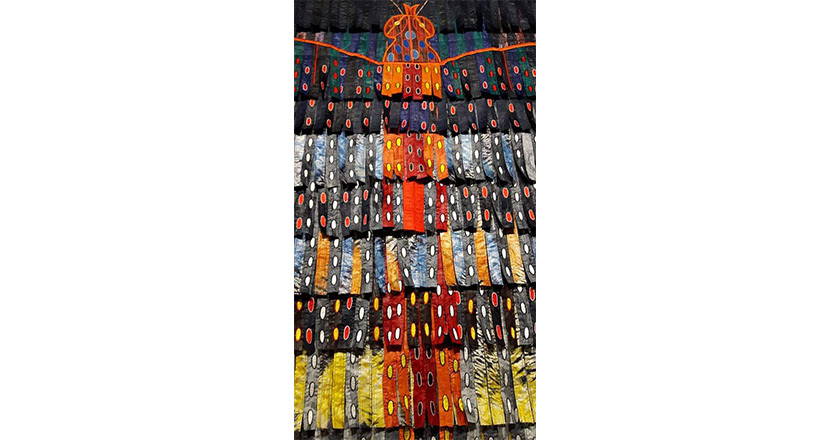 Fjärilstavla av Konaté gjord av färgade bommullsremsor som broderats.