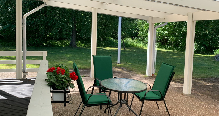 - har en insynsskyddad trädgård med stor uteplats under tak.