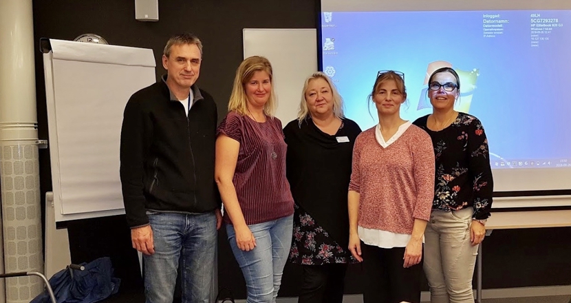På gruppbilden ovan ses neurologläkare Olof Danielsson, arbetsterapeut Maria Nilsson, kurator Eva Stenelund, fysioterapeut Marielle Karge samt Åsa Lundin, länskoordinator för CSD.