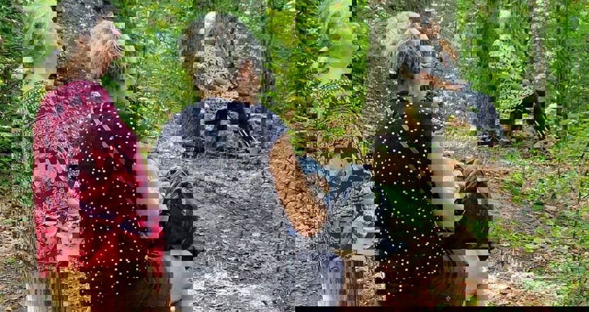 Så gick ett gäng upp i skogen för ”skogsbad”, man sitter på marken med ryggen mot ett träd och så blundar man och slappnar av, man gör precis som ledaren säger.