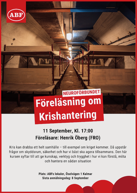 I samverkan med ABF bjuder Neuro Kalmar in till ett viktigt informationsmöte om hur vi som individer och samhälle kan förbereda oss inför kris eller krig. Under kvällen får du ta del av konkreta råd, information och möjlighet att ställa frågor kring beredskap och säkerhet.
