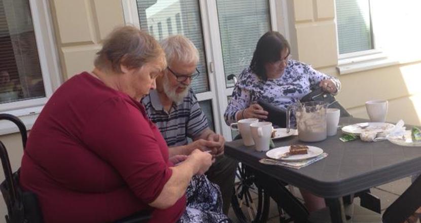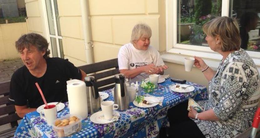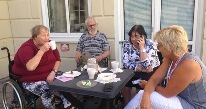 En solig sista caféträff för våren på vår härliga innergård.