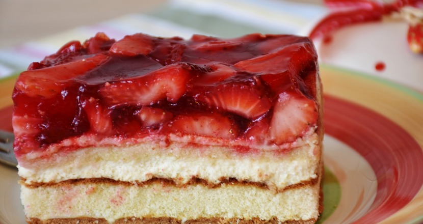 En bit jordgubbstårta upplagd på en tallrik. Foto.