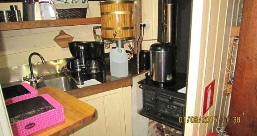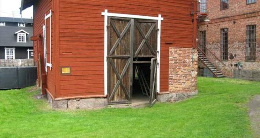 Kalorifären vid Forsviks Bruk. Den heta luften från kalorifären torkade pappersmassan som framställdes i träsliperiet. Kalorifären eldades med ved och hettade upp en värmeväxlare. Remdrivna fläktar förde in hetluften via den svarta tuben till torkugnarna i träsliperiet.