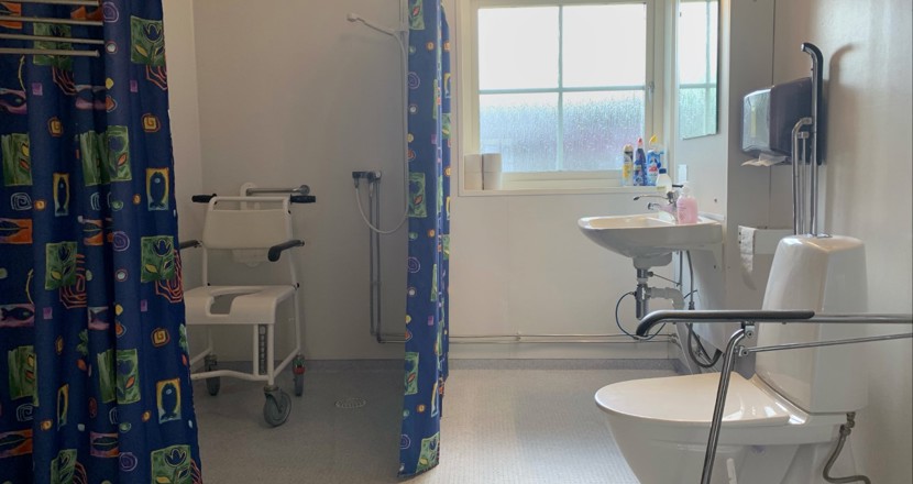 - ett badrum med stor dusch och duschstol och en stor toalett med tvättmaskin.