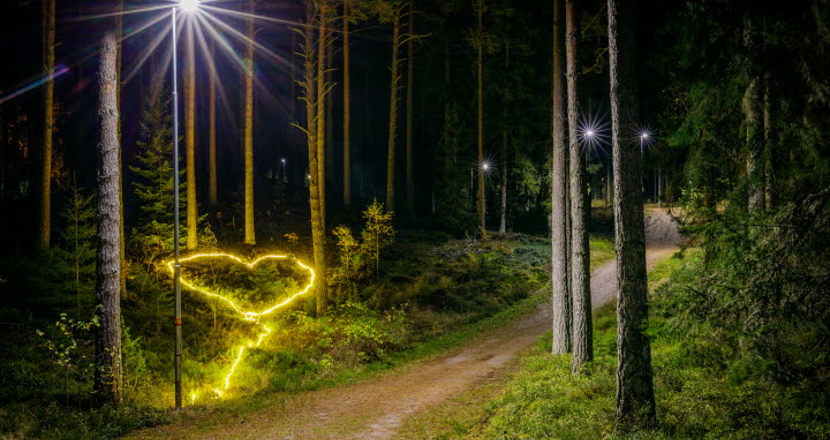 Hjärtformade ljusslinga bredvid en stig i skogen.