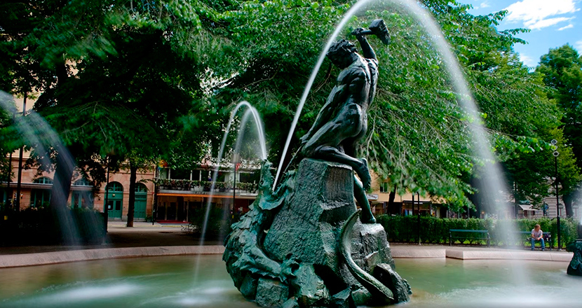 Start - vi träffas på Mariatorget vid Per Hasselbergs staty ”Tors fiske”.