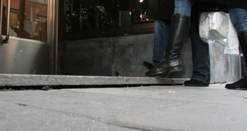 Irriterande liten vanlig 4-centimeterskant, som verkligen ställer till det för den som är rullstolsburen. Det här mötte många på väg in till Humanas assistansdebatt, som hölls på Bygget Fest & Konferens, Norrlandsgatan 11 i Stockholm