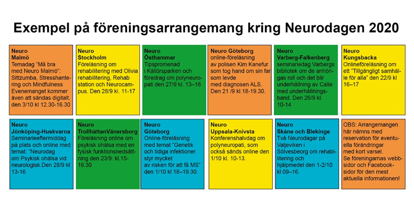 Programdetaljer och exakta tider om den årliga Neurodagen finns på Neuros webbplats och på Neuroföreningarnas respektive webbplatser (se länk nederst i artikeln) och respektive förenings Facebooksida.